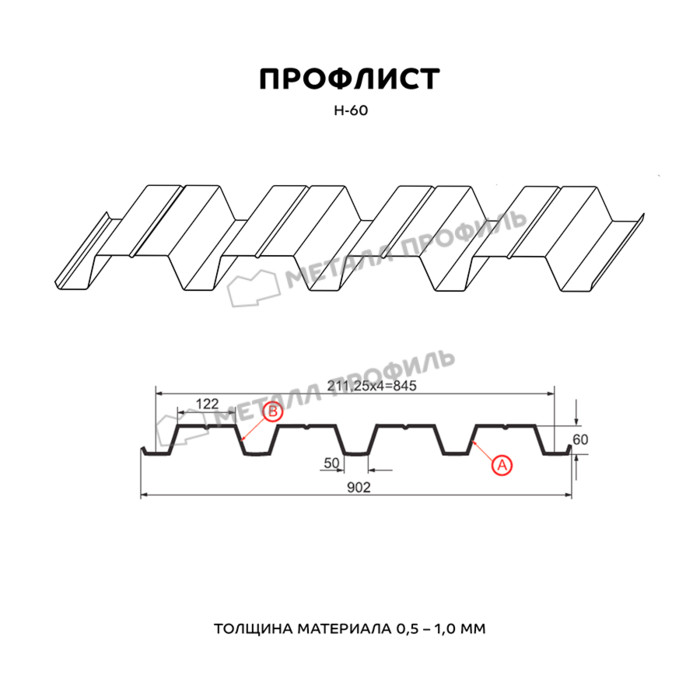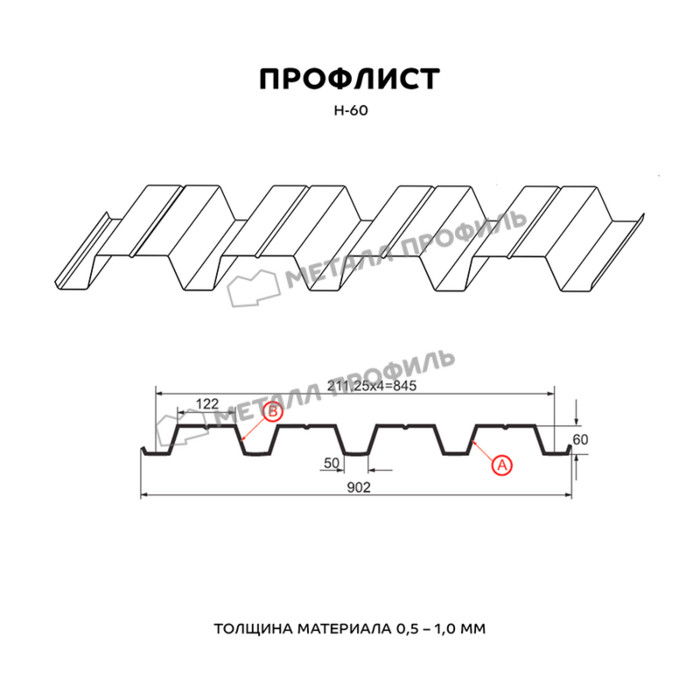 Профнастил, отмеченный маркировкой Н, представляет собой несущий материал, а цифра 60 указывает на высоту волны в миллиметрах. Если материал имеет канавку, это придает дополнительную прочность профилю. Продукция выпускается в двух вариантах: оцинкованный профнастил Н60 и профнастил с полимерным покрытием с одной или двумя сторонами. При одностороннем покрытии краска может быть нанесена на сторону, обозначенную буквами А или В. Качество материала регулируется стандартами ГОСТ Р 52246-2004 и ГОСТ Р 52146-2003. Цветовая гамма окрашенного профиля представлена в палитре RAL, однако возможны индивидуальные цветовые решения с увеличением стоимости и времени изготовления. Оцинкованный профнастил с плотностью покрытия от 140 до 275 г/м2 считается стандартом качества. Несущий профиль Н60 может иметь толщину от 0,4 до 1 мм. Для кровельных работ и опалубки наиболее популярна толщина 0,7 мм. Рабочая ширина профиля составляет 845 мм, а общая ширина – 902 мм. Листы укладываются внахлест, а заводская нарезка материала позволяет получить листы длиной от 0,5 до 12 метров. Профиль Н60 с более плотным оцинкованным слоем обеспечивает меньшую вероятность коррозии и обладает более длительным сроком службы, превышающим 50 лет.